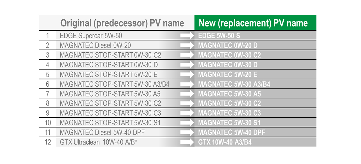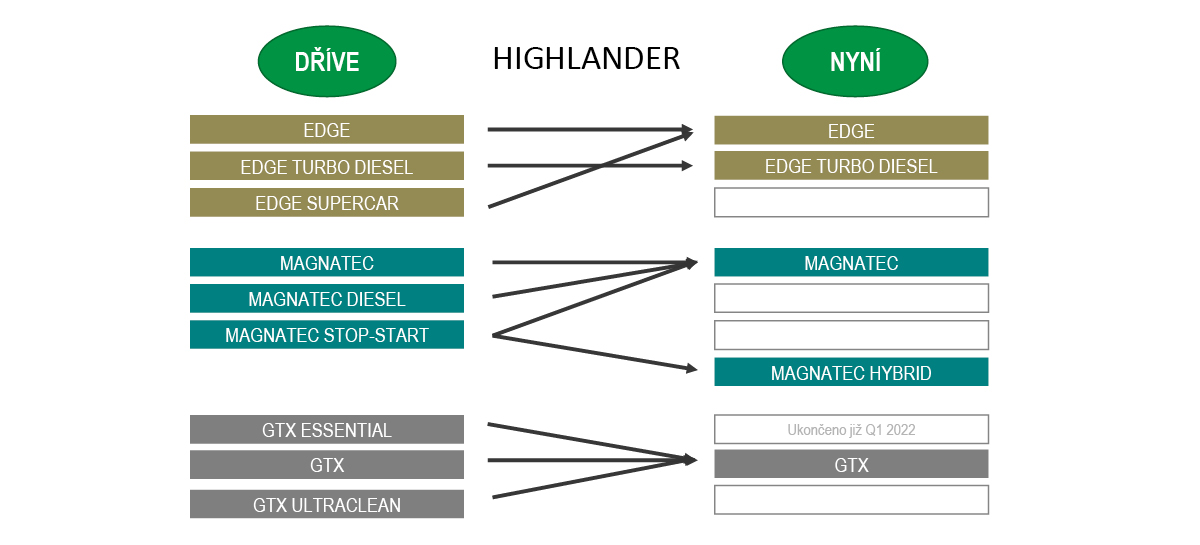 Další významnou úpravou prošly názvy motorových olejů Castrol řad EDGE, MAGNATEC a GTX, kde došlo ke sjednocení názvů, viz. přehledná tabulka níže.