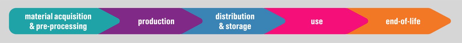 Obrázek níže pochází ze standardu vykazování životního cyklu produktu protokolu GHG a ukazuje klíčové činnosti, které tvoří životní cyklus produktu. Pro kvantifikaci emisí skleníkových plynů produktu se primární a sekundární údaje shromažďují pro každou činnost a používají se ve spojení s emisními faktory (koeficienty) k převodu údajů o činnosti na emise skleníkových plynů.